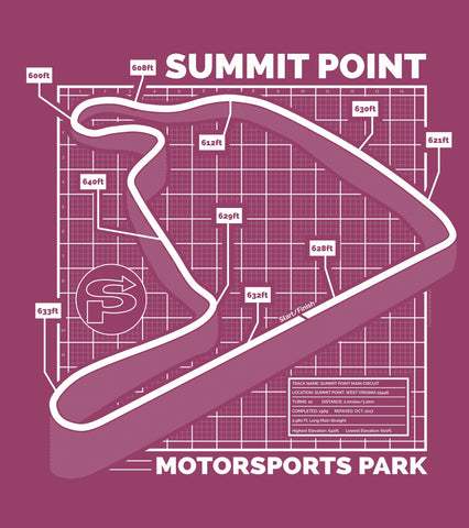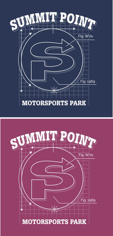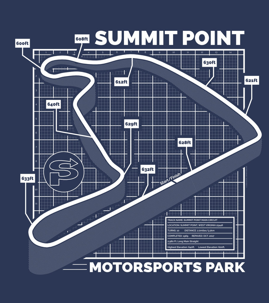 On the front left chest there's a Summit Point Motorsports Park logo, complete with draftsman-style technical annotations.